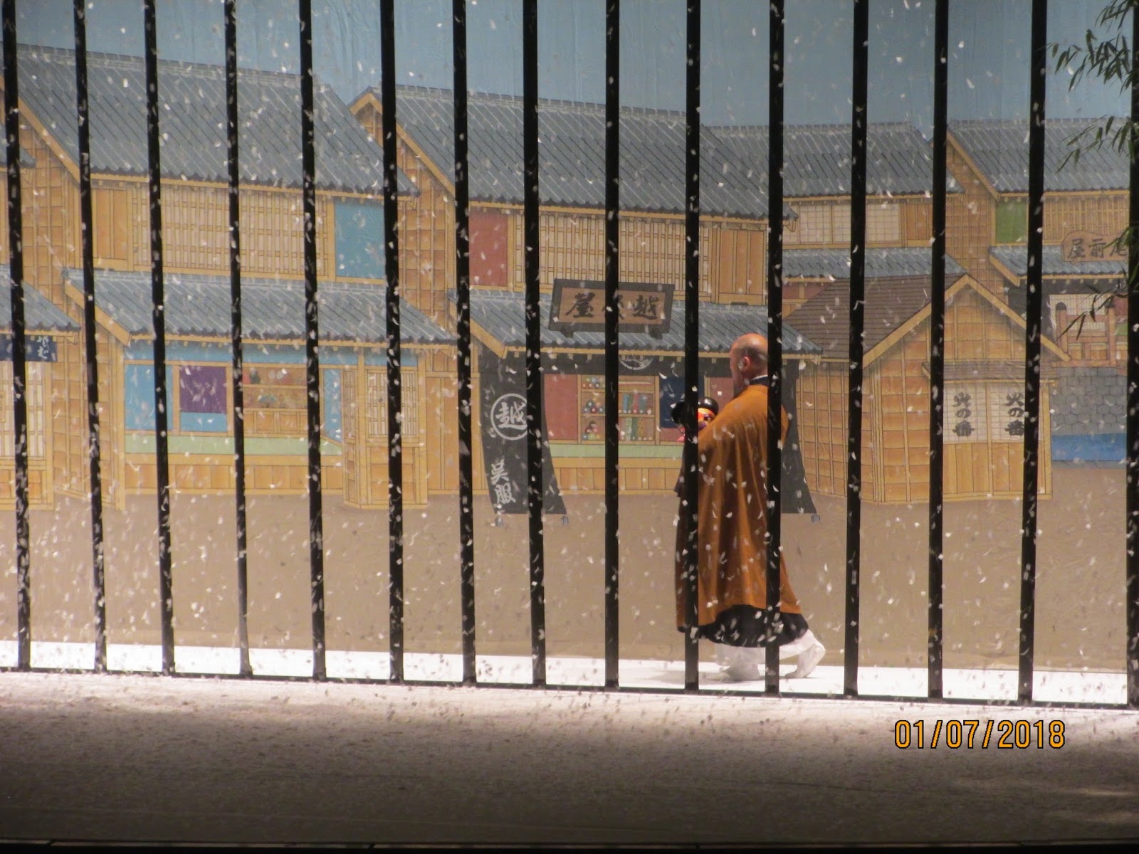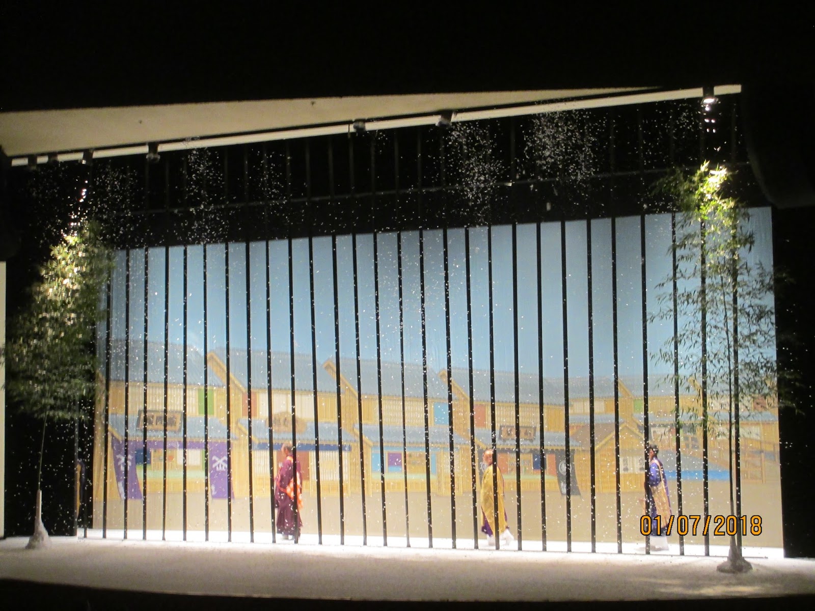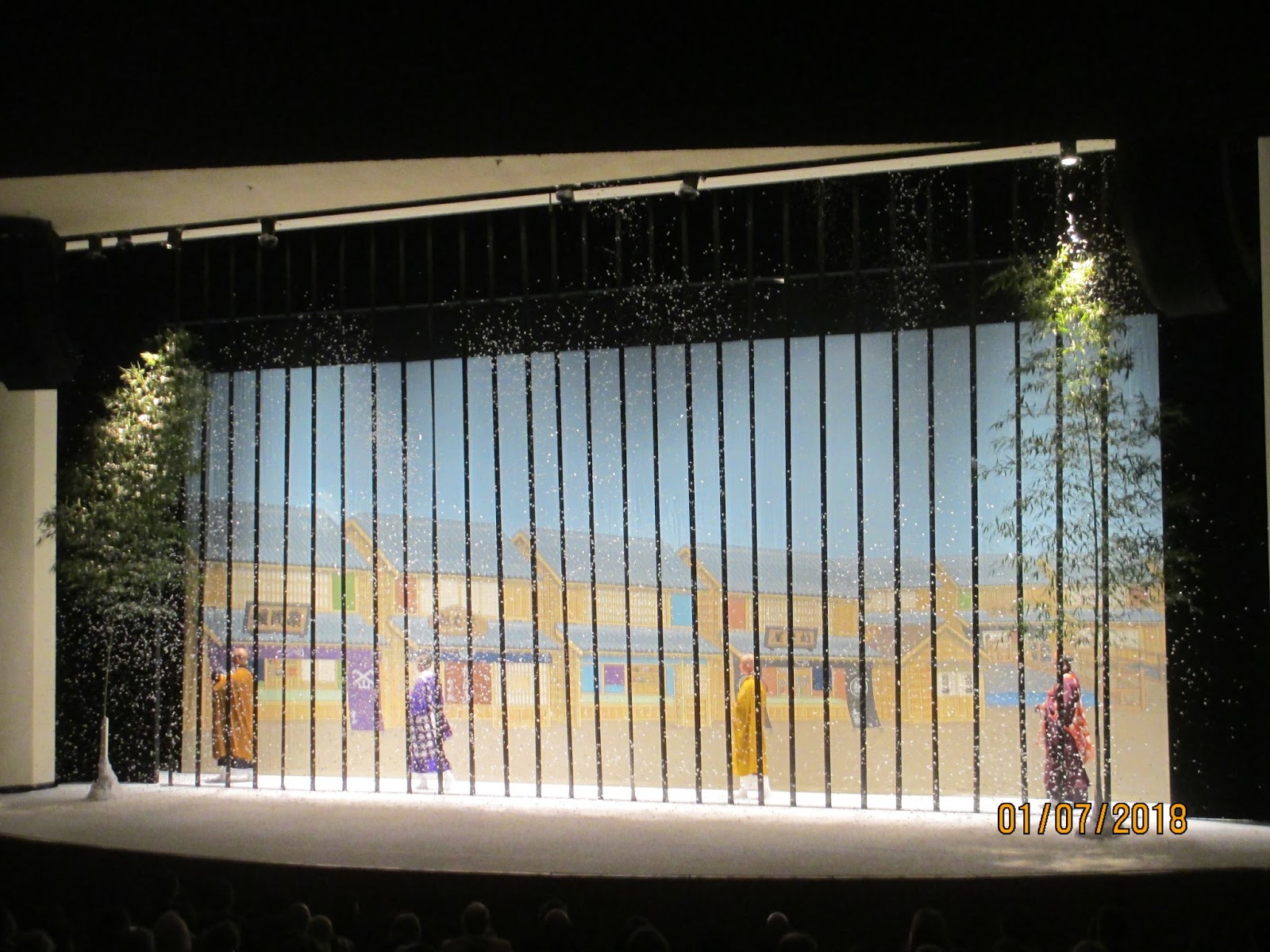 Actually all we see is the dynamic conductor. The singers are above us in the balcony, we hear the beautiful voices all around us.As the curtain is raised the snow begins to fall and a Buddhist monk walks across the stage ringing a bell.