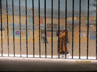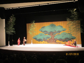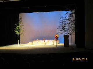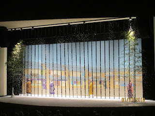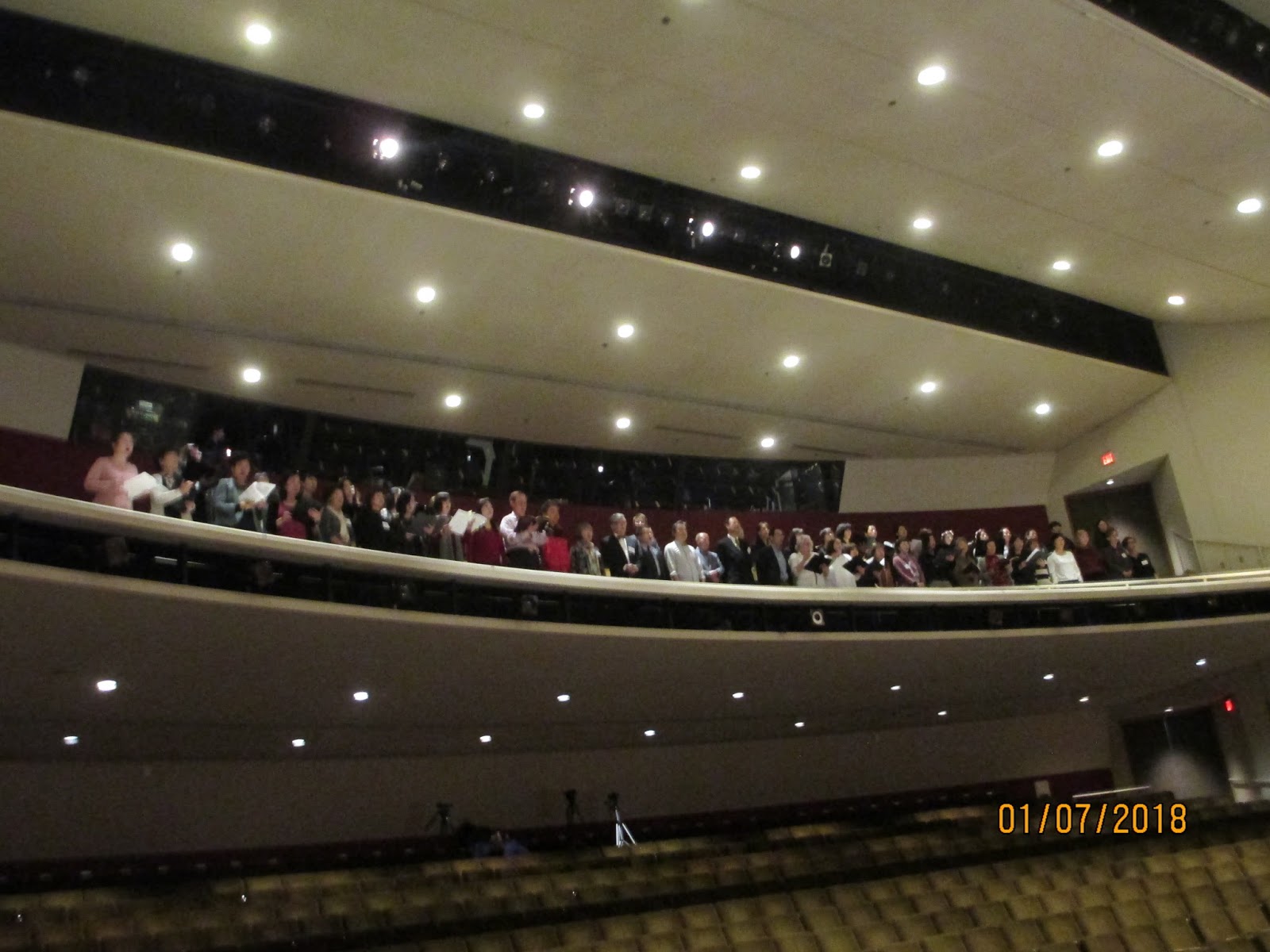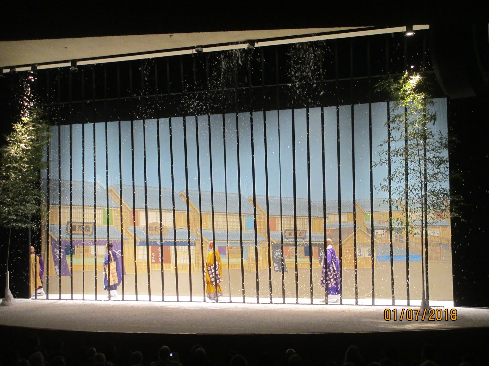 Actually all we see is the dynamic conductor. The singers are above us in the balcony, we hear the beautiful voices all around us.As the curtain is raised the snow begins to fall and a Buddhist monk walks across the stage ringing a bell.